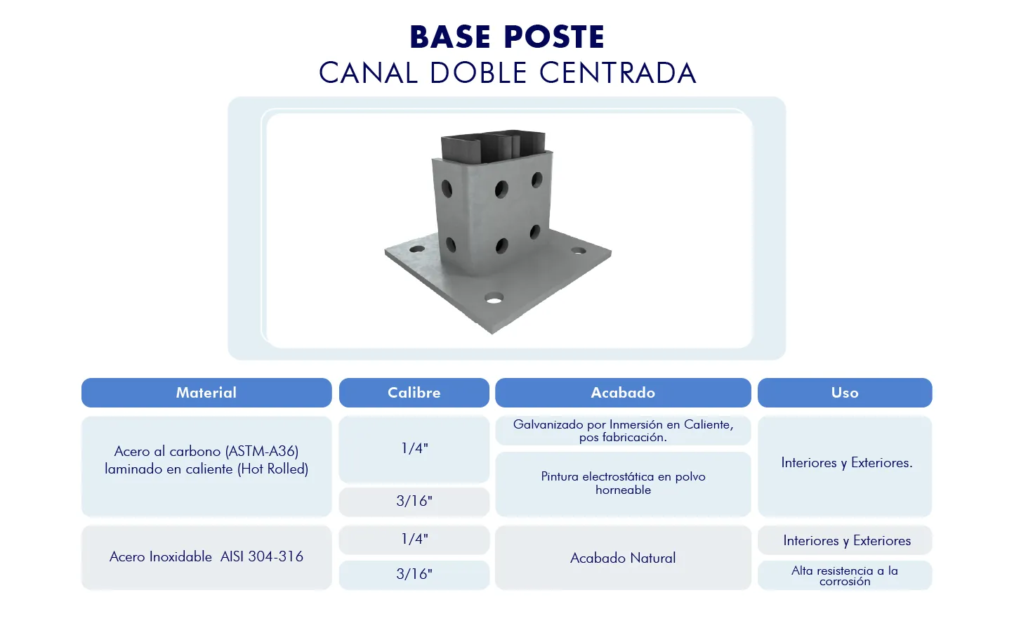 Las Bases Para Poste son elementos estructurales por medio de los cuales se ancla a piso cualquier tipo de Canal o combinación de ellas cuando trabajan como columna, contribuyendo a aumentar la rigidez de la estructura.