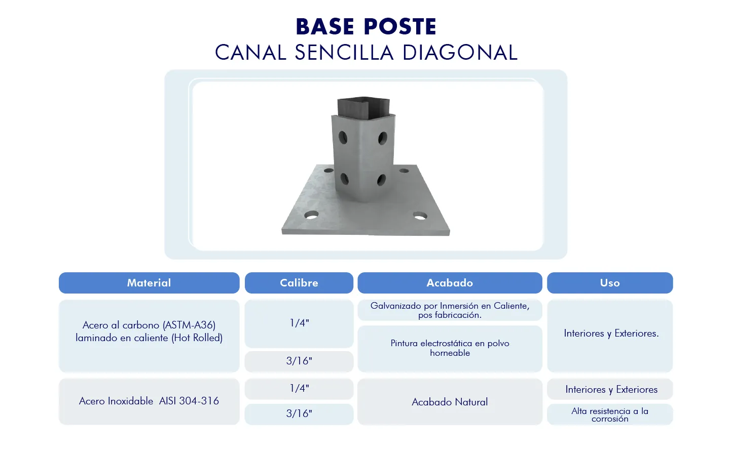 Las Bases Para Poste son elementos estructurales por medio de los cuales se ancla a piso cualquier tipo de Canal o combinación de ellas cuando trabajan como columna, contribuyendo a aumentar la rigidez de la estructura.