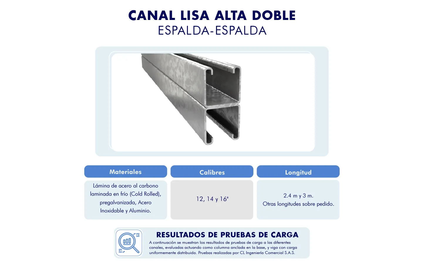 El canal estructural o Perfil metálico con geometría en «C» con pestañas hacia su interior, que se emplea para soportar y/o fijar sistemas portacables, tuberías, entre otros. La canal puede ser «Lisa» (sin perforaciones) o «Troquelada» (con perforaciones tipo slot). Dimensiones de su sección transversal: 1 5/8″ x 1 5/8″ (Alta) ó 1 5/8″ x 7/8″ (Baja). La canal es compatible con cualquier sistema portacables.