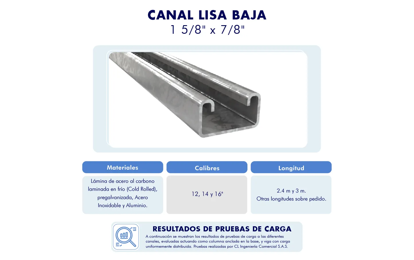 El canal estructural o Perfil metálico con geometría en «C» con pestañas hacia su interior, que se emplea para soportar y/o fijar sistemas portacables, tuberías, entre otros. La canal puede ser «Lisa» (sin perforaciones) o «Troquelada» (con perforaciones tipo slot). Dimensiones de su sección transversal: 1 5/8″ x 1 5/8″ (Alta) ó 1 5/8″ x 7/8″ (Baja). La canal es compatible con cualquier sistema portacables.