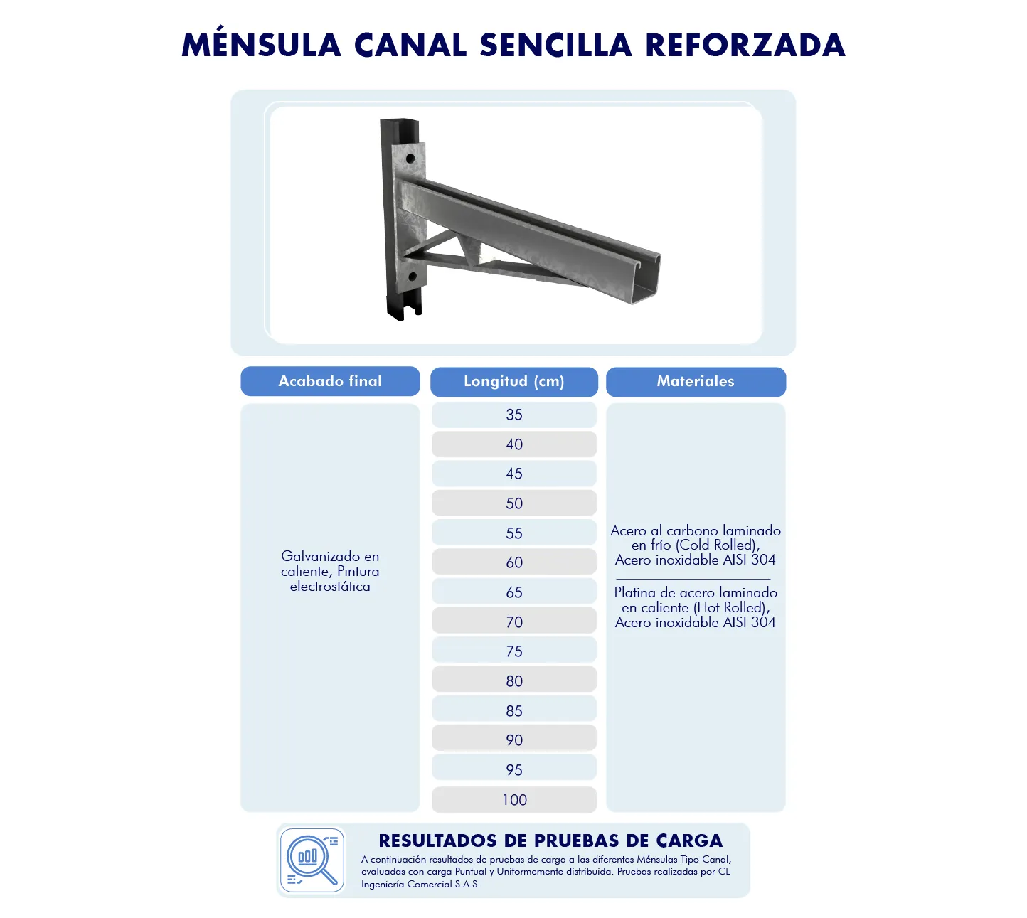 Fabricada con Canal Alta calibre 14 ya sea Lisa o Troquelada, y Platina Base desde 2″ x 1/4″ provista de dos perforaciones Ø 9/16″ para faciltar su anclaje a pared o columna;