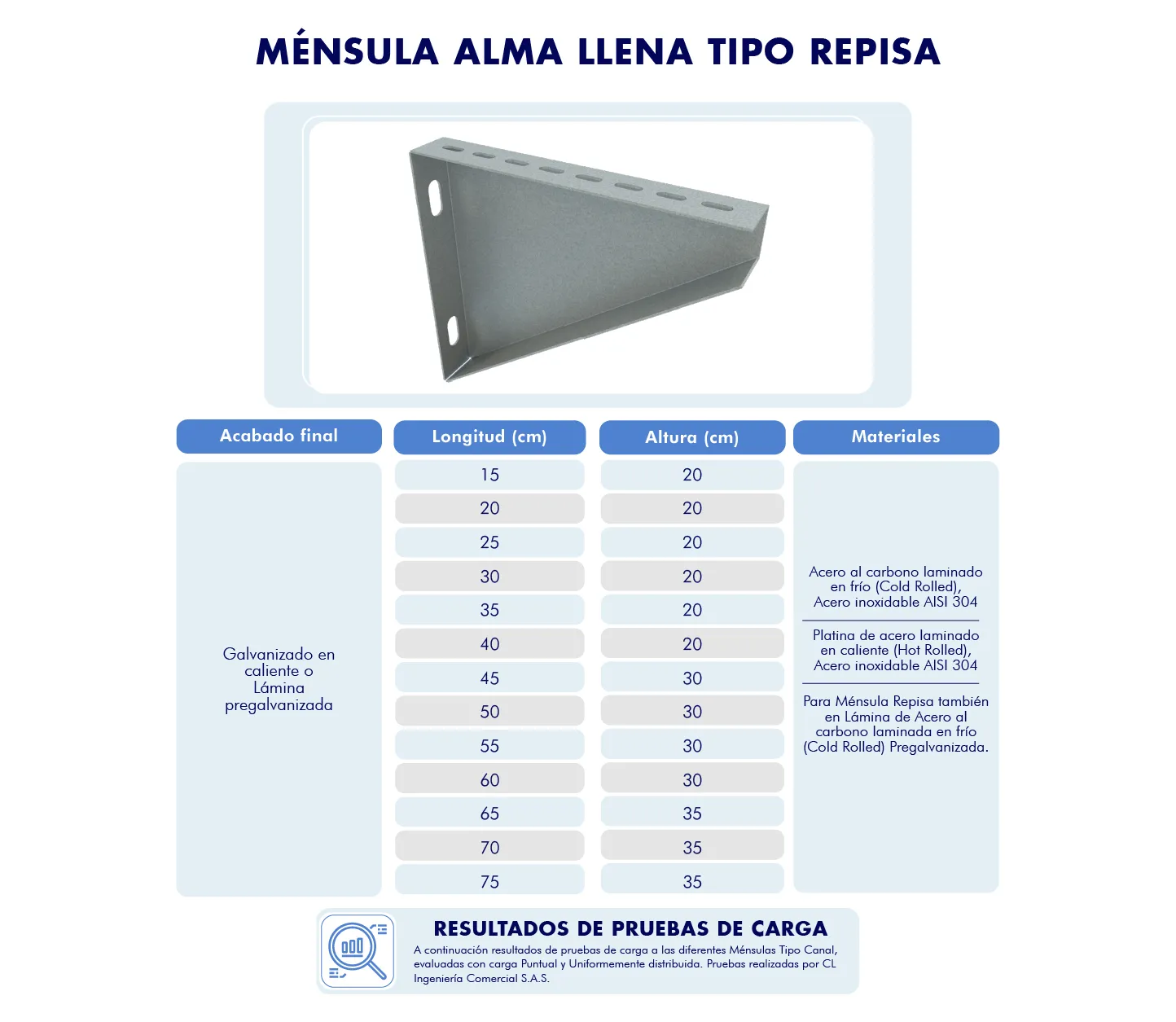 Fabricada en lámina calibre 12 ó 14 troquelada y doblada, también provista de dos o más perforaciones tipo slot para facilitar su anclaje a pared o columna.